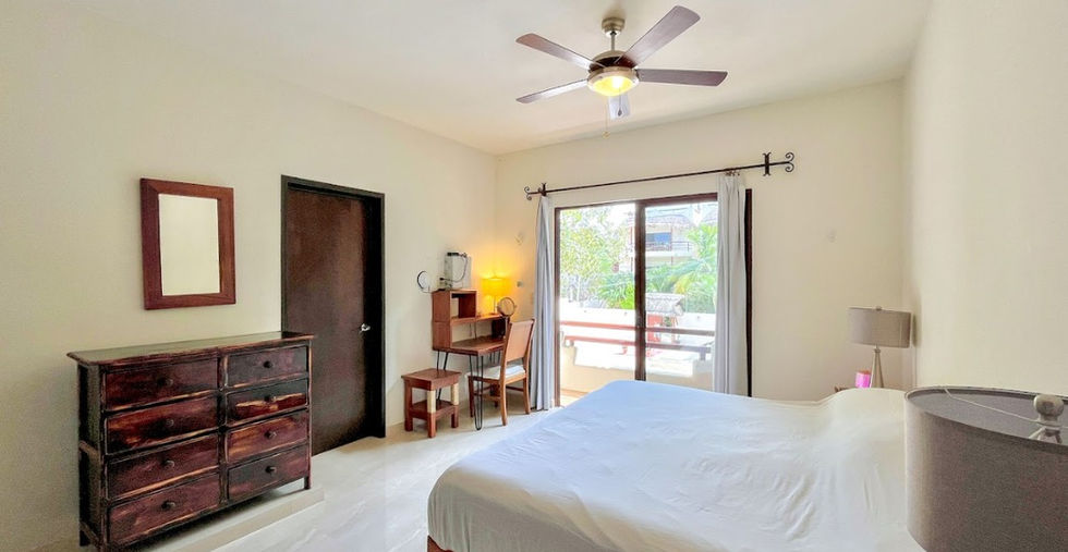 The penthouse is Casa Sally's highlight. It offers high ceilings, plenty of natural light in the living and kitchen areas, and a balcony surrounded by trees. It's ideal for relaxing or entertaining, with views that connect you to the outdoors. The main bedroom faces the street, capturing Tulum's lively atmosphere.